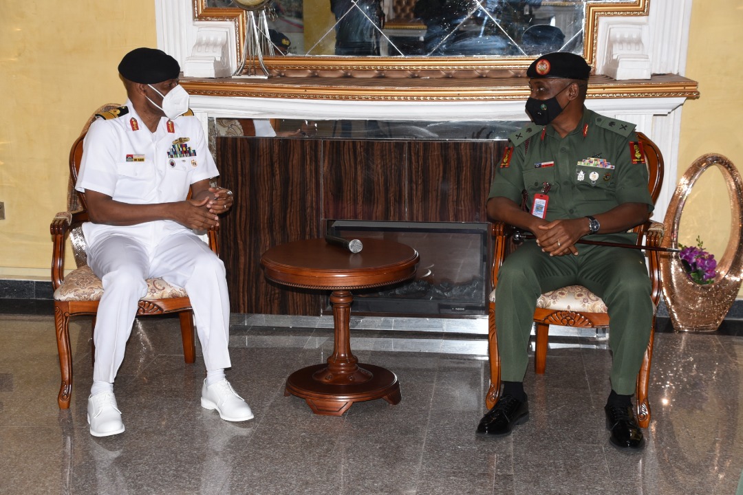 The Commandant Army War College Nigeria (AWCN) Maj Gen SE Udounwa pays a courtesy call on the Commandant, National Defence College Nigeria, Rear Admiral MM Kadiri of Friday 7th July 2020.