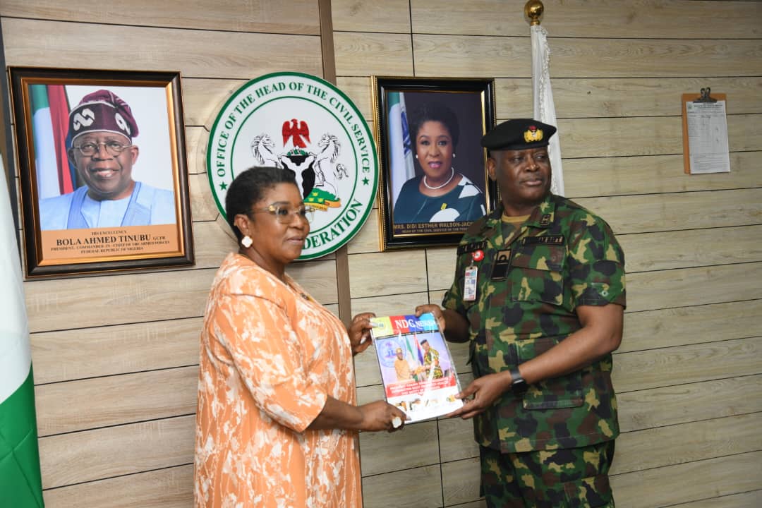 The Commandant of the National Defence College (NDC), Rear Admiral Olumuyiwa Olotu, paid a courtesy visit to the Head of the Civil Service of the Federation, Mrs. Didi Esther Walson-Jack, OON, mni, at her office in Abuja. During the visit, Rear Admiral Olotu described the NDC as Nigeria’s apex military training institution, offering strategic-level education to senior military officers, top officials from Ministries, Departments and Agencies (MDAs), as well as participants from allied countries. He underscored the College’s vital role in strengthening national and regional capacity, particularly through its Centre for Strategic Research and Studies. The Centre, he noted, partners with ECOWAS on various initiatives and also organizes training programmes and retreats for members of the National Assembly.